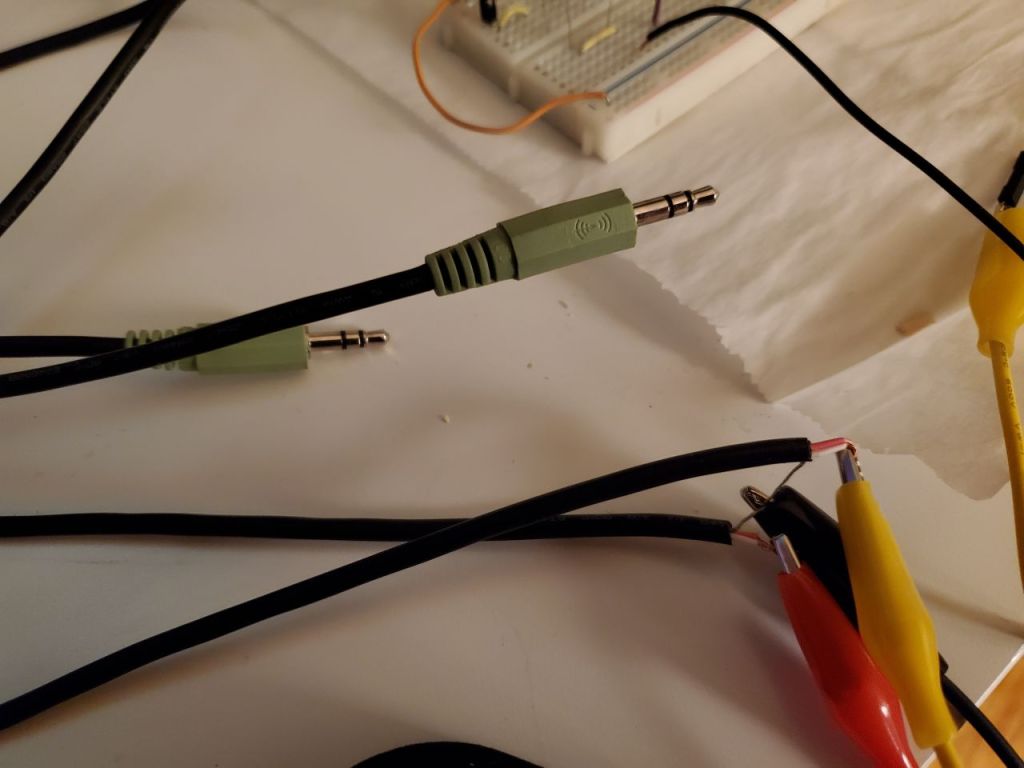 These were easily tested on a breadboard, applying small voltages to one of the wires and grounding the others with LEDs. Observing the outputs from the speaker and mic, I was able to identify the Yellow as the signal for the headphones, read as the signal for the microphone, and the green as the ground.