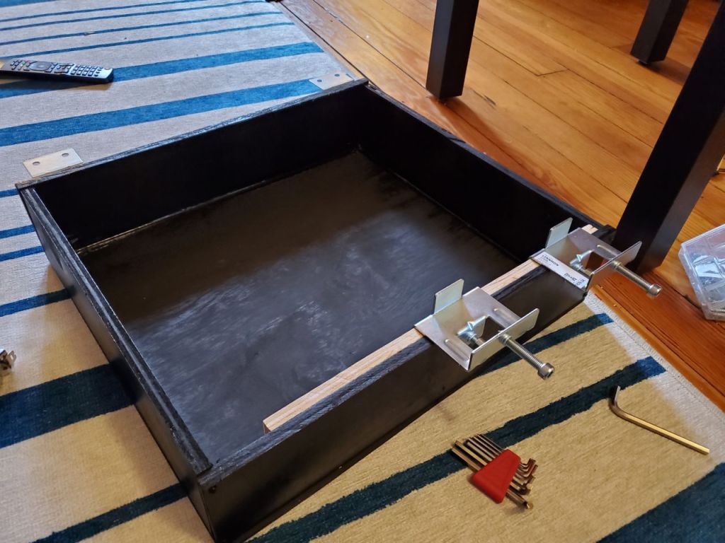 The box was then attached to the back of the enclosure on the top with two L brackets, and on the bottom with the Linnmon connecting hardware from IKEA that I had extra.