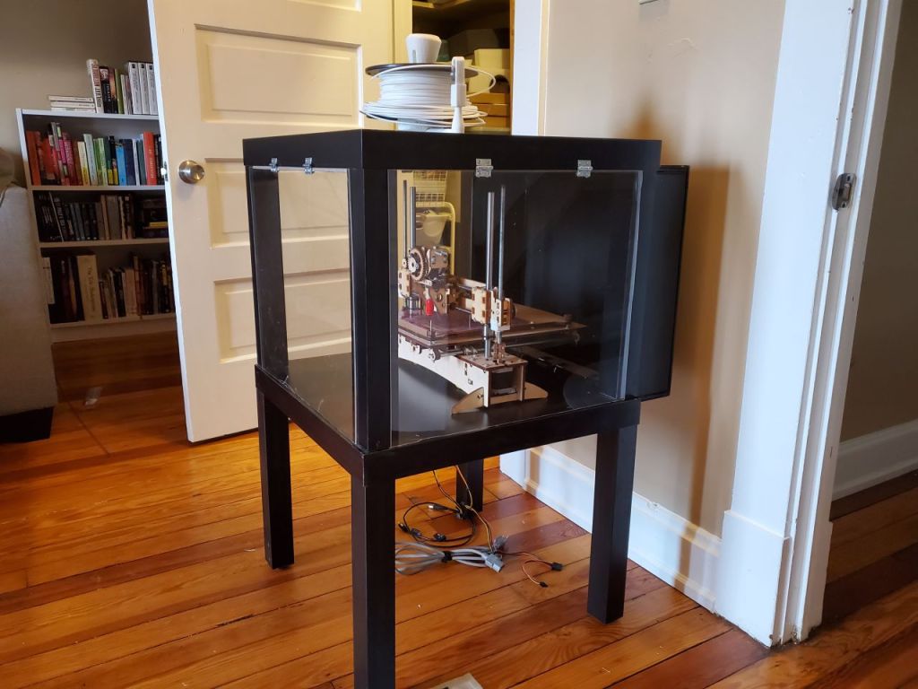 Inspired by the 3d printer enclosure here: https://blog.prusaprinters.org/cheap-simple-3d-printer-enclosure_7785/, I tried to construct by own out of two extra LACK tables that I had sitting unused.