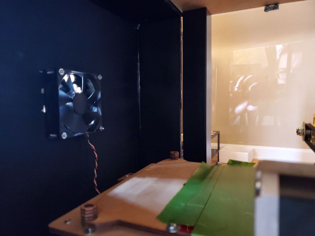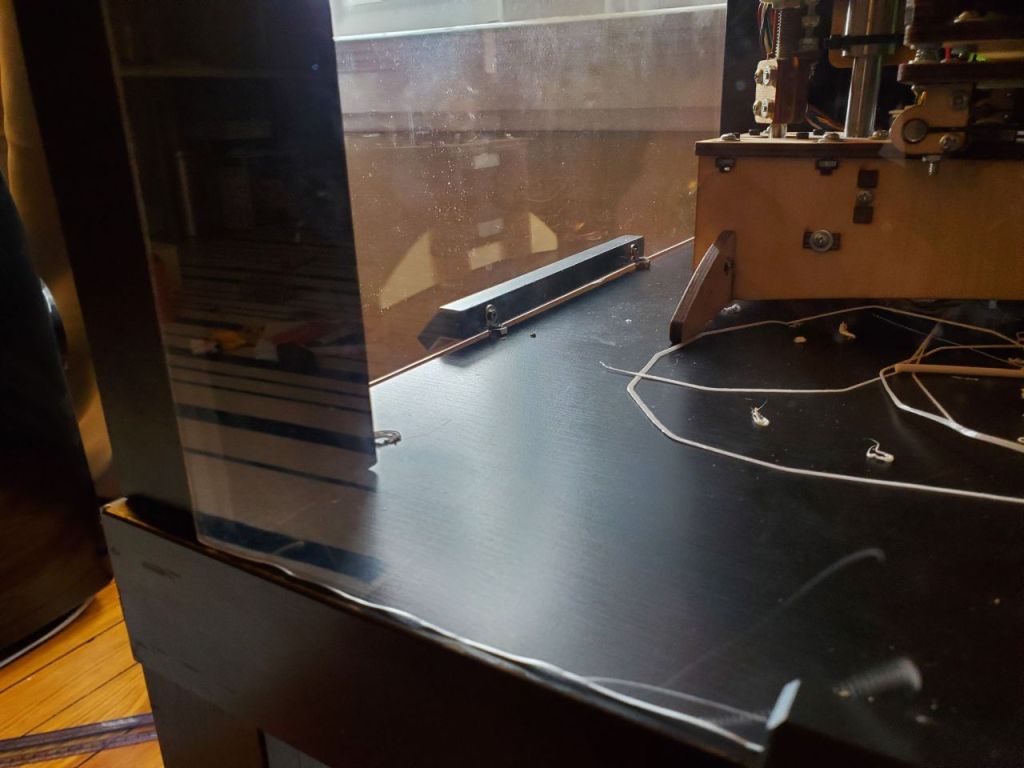 The next problem I encountered was the size of my 3d printer, an original Printrbot LC. Under full operation, the bed extends beyond the edge of the table, so I could not enclose the last side with the same plexiglass. To overcome this, I used some scrap plywood to make a 5 sided box to attach to the back.