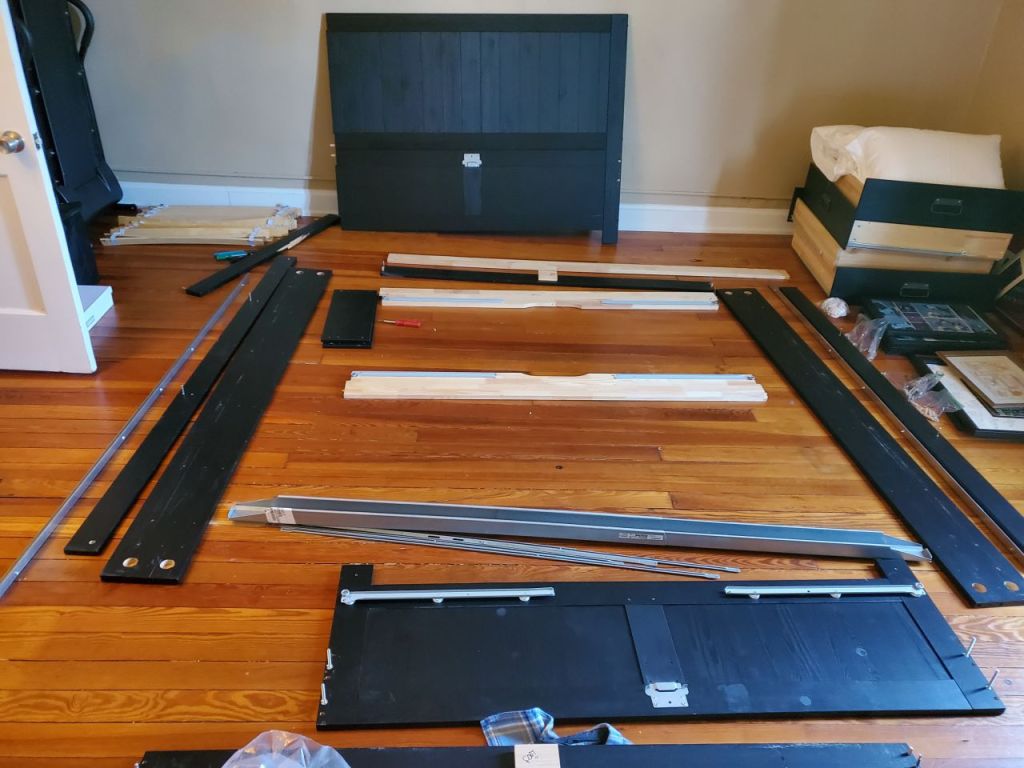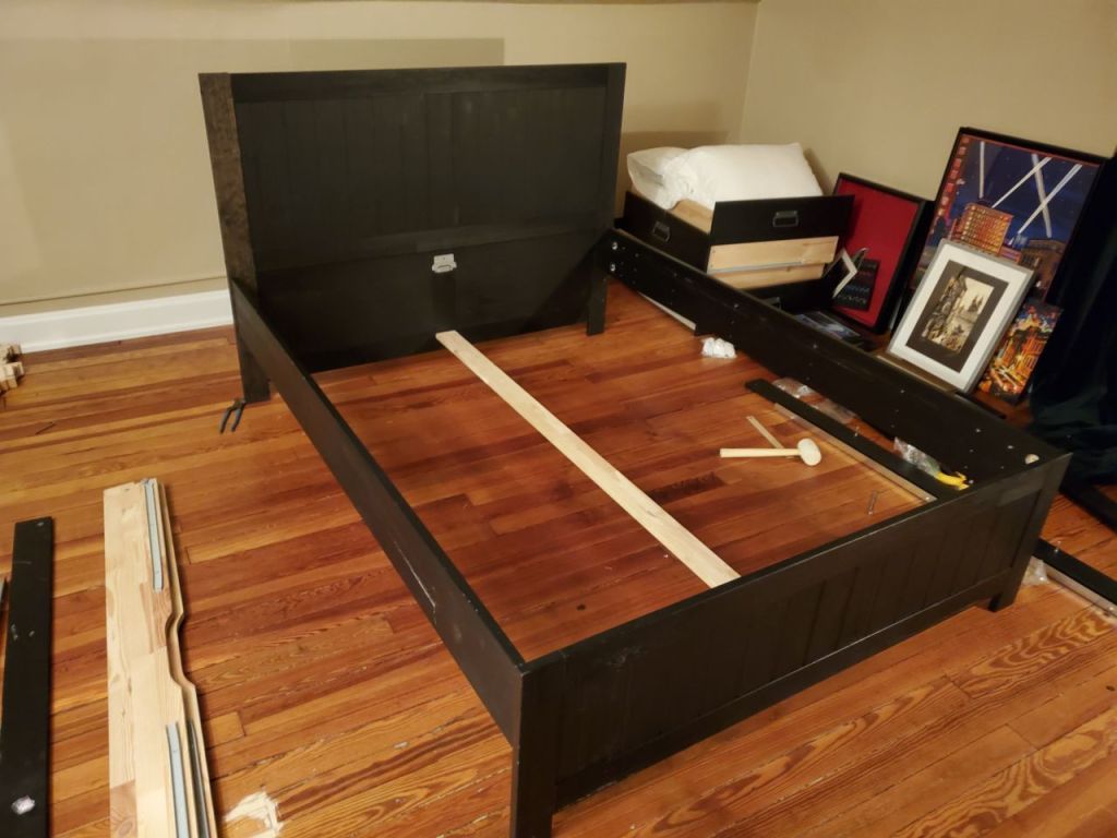 One of my recent builds that I am the most proud of is repair to our IKEA bedframe that got damaged in a recent move. The damage was entirely my fault – in deconstructing the bed, I was convinced that only one large bolt attached the side boards to each corner, based on current designs of IKEA furniture. I had forgotten the model name of our bed, and it has long since been discontinued. At the same time, I decided to save some time and not remove the rails that held the cross boards that held the mattress. Of course, those rails hid the four other bolts that secured the head and foot boards to the side boards. After struggling with a corner for a while dissembling the bed, I discovered the hidden bolts by ripping one straight out of the headboard. So, I had two options – scrap the bed, since replacement parts are discontinued, or try to construct a new one.