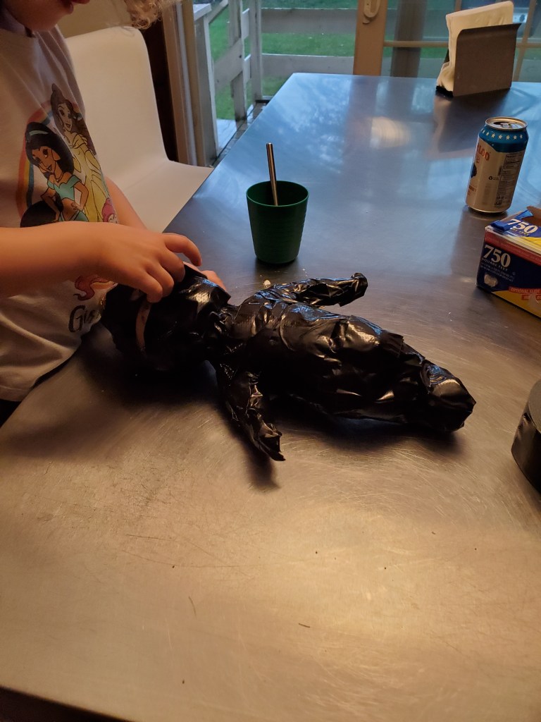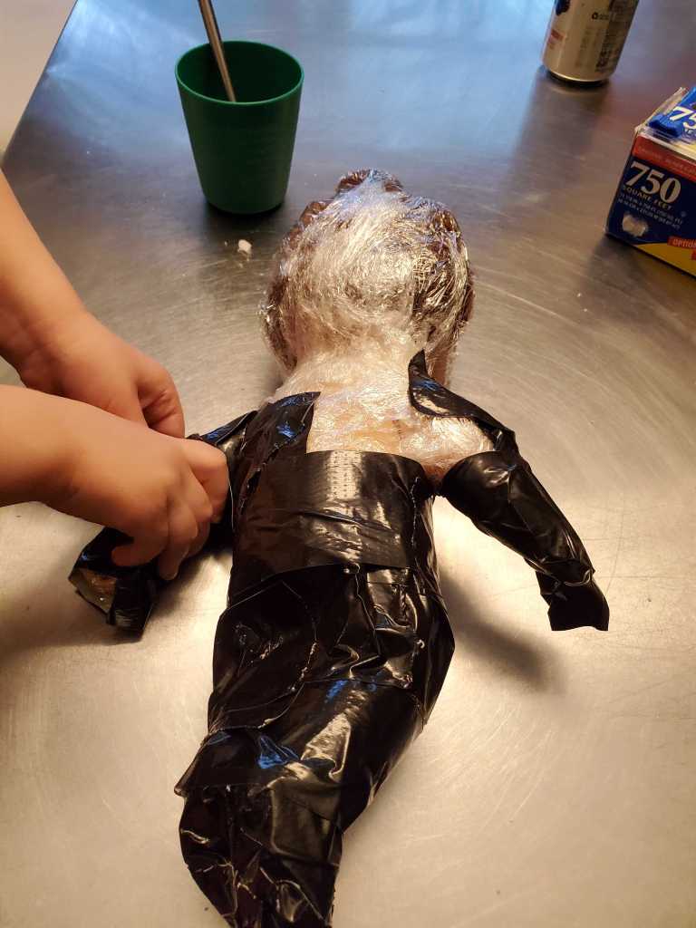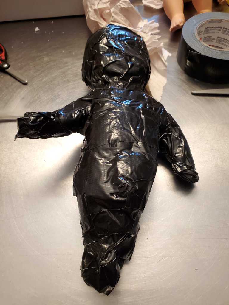 We let the rags soak while we prepped the rest of the mummy. After the plastic wrap, we wrapped the doll in a nice, thick layer of duct tape.