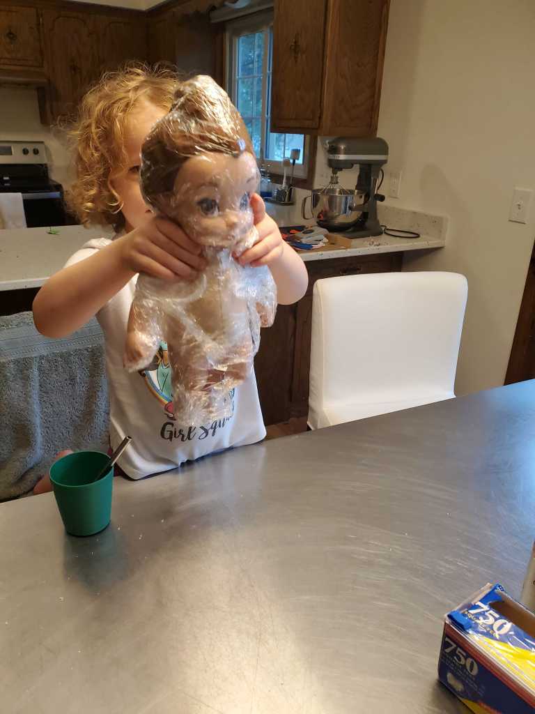 We have been busy crafting up a storm here to fill our house with Halloween decorations, and my toddler is loving to help. She is absolutely in love with all things monster and scary. Looking around on Youtube for ideas, she instantly took to the idea of making a mummy, like found here. Needing a specimen to mummify, I asked my toddler who we should use, and she enthusiastically said, “Baby Belle.” So, we mummified her Baby Bell doll.