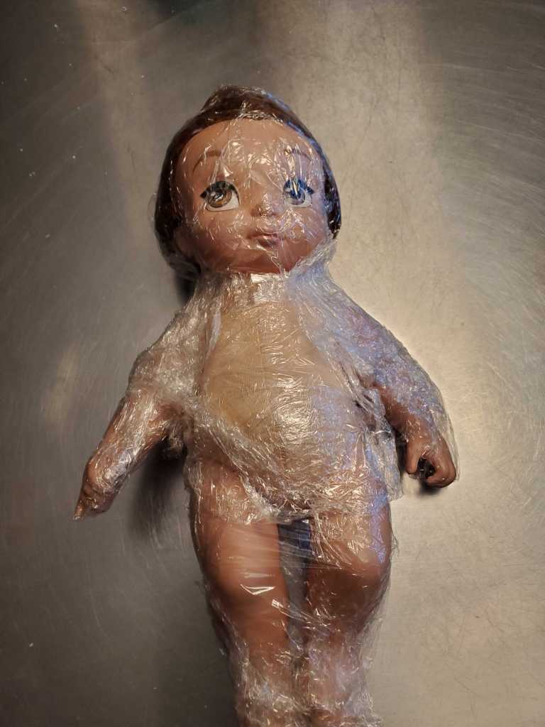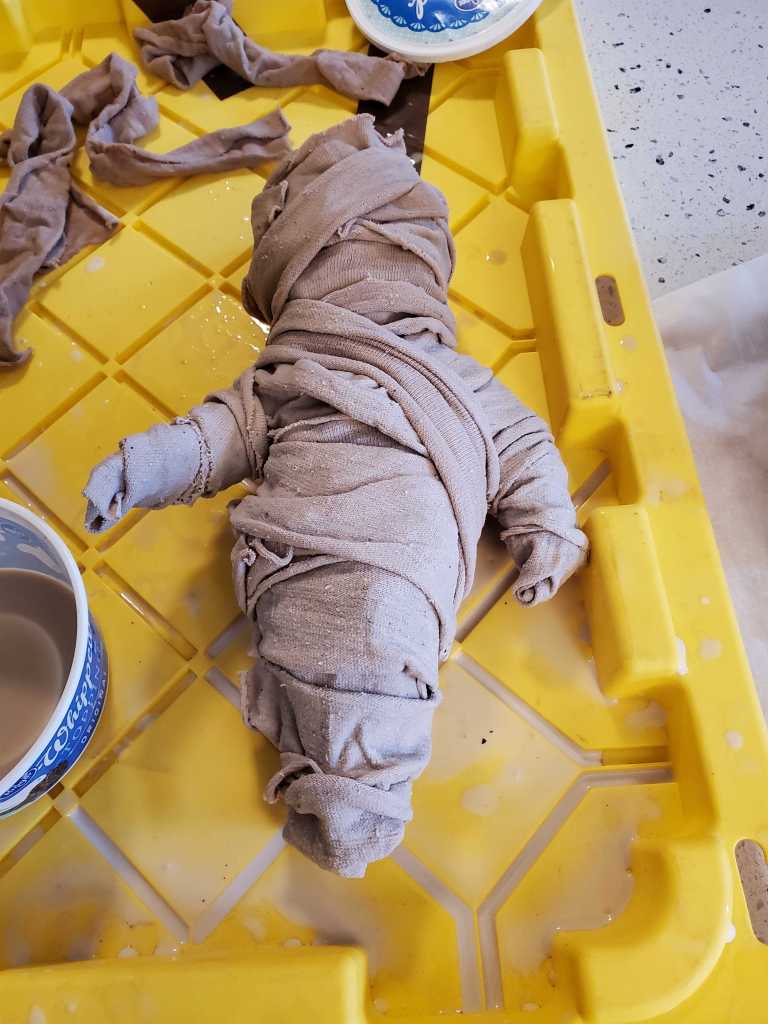 First, we wrap the mummification specimen in plastic wrap. Already looking very creepy.