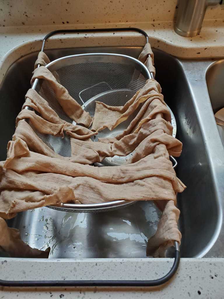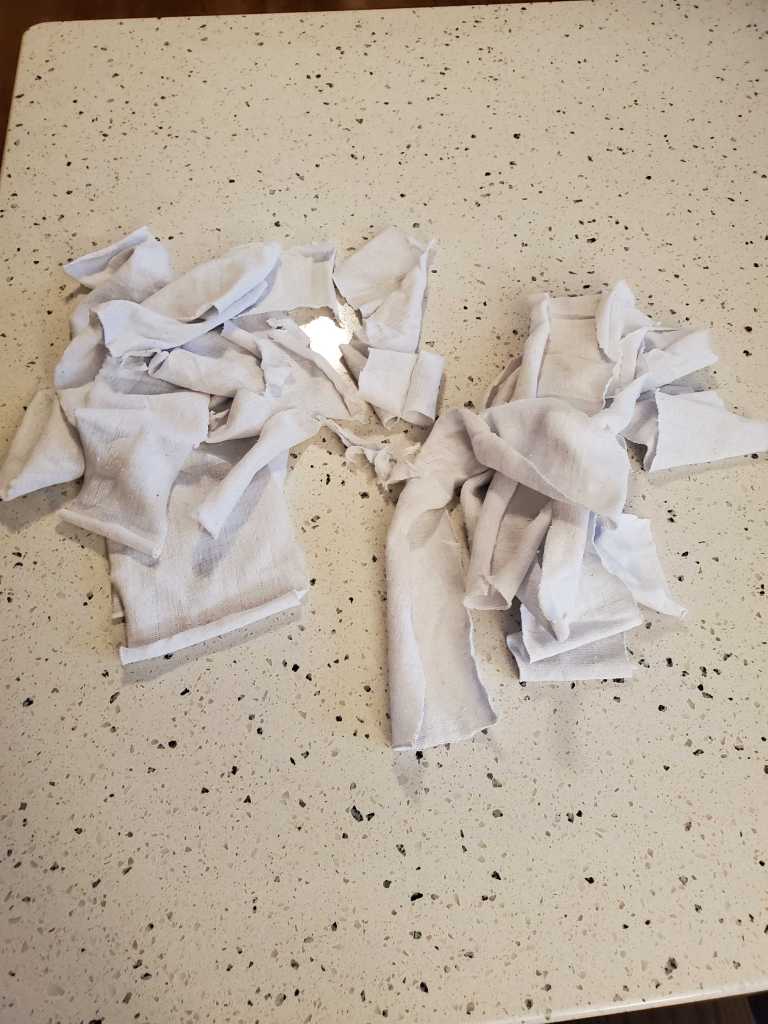 Then it was time to prepare the wraps, to make sure they had plenty of time to soak. For the wraps, I got cheap stain/paint clothes from Lowes, cut them up into rough strips, and prepared a big pot of tea (the cheapest stuff we had).
