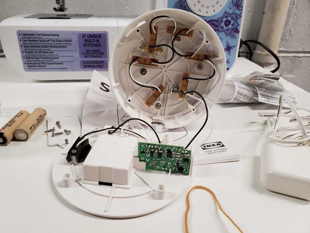 This little plastic dome was the exact dimensions that I needed, and it already had the wiring for LEDs along with a switch and rechargeable battery! I brought it home and got to taking it apart to hack it. The only other thing I needed were UV LEDs, which I got a string of from Amazon. The model I got is not available anymore, but any blacklight LED will illuminate uranium glass, I would imagine. First task, remove the dome and case and see what kind of electronics I was dealing with.