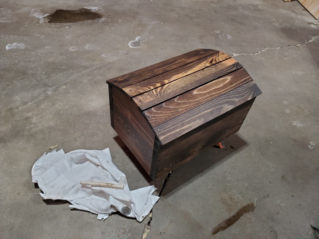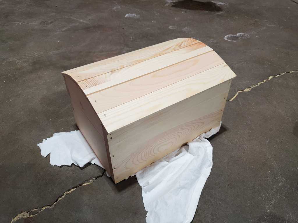 To mimic this chest, I began by applying a coat of dark stain to the chest. Since this was a cheap chest from Michaels, I went with a Minwax stain from Lowes.